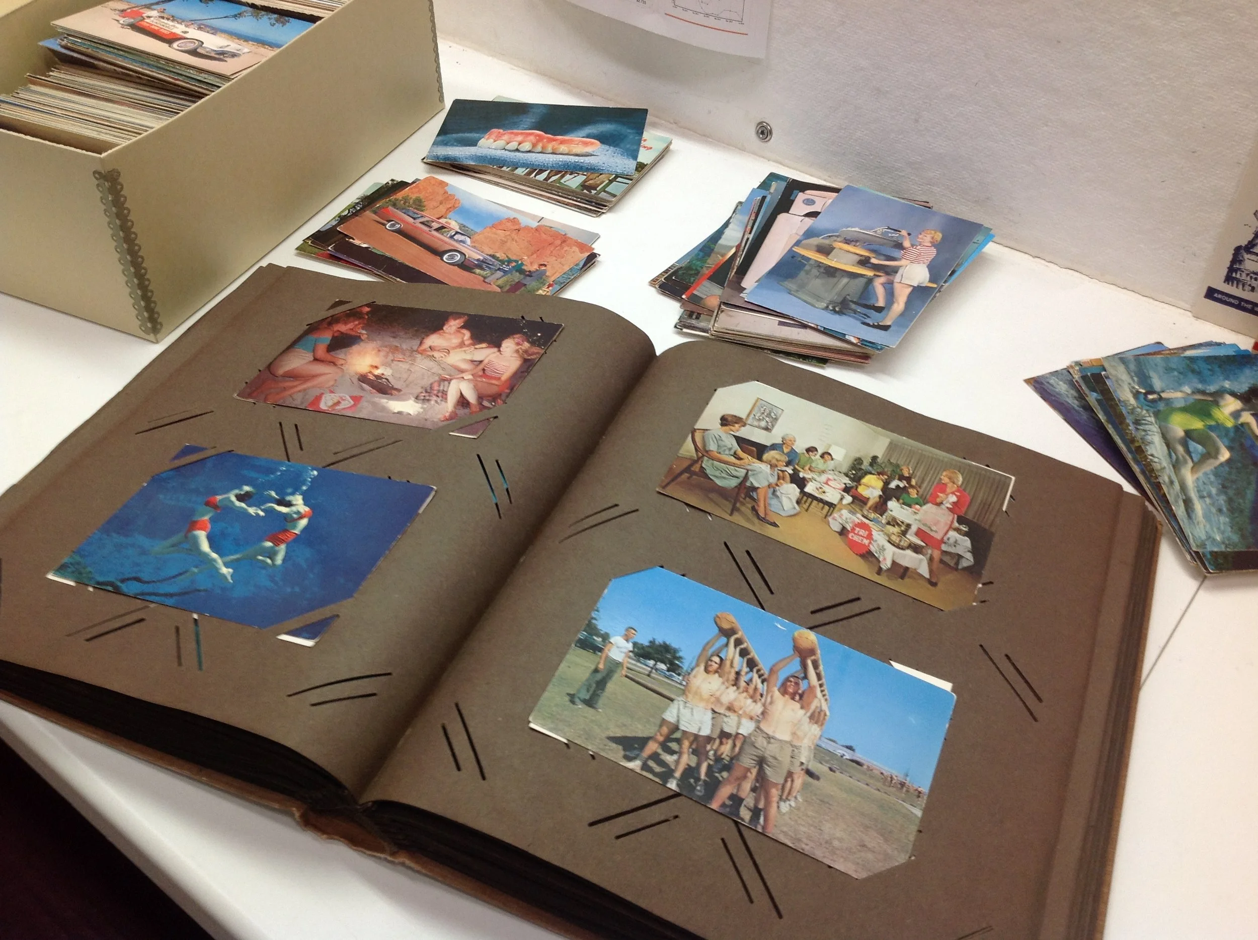 Step one was winnowing a few thousand cards down to about twice as many as the two hundred-ish I ended with. Step two was a couple of months of transforming the cards’ quirksand revelations into allusive narratives. Basic form is two page spreads. The rest is to nail the look. I like the idea of showing the cards in thesort of album designed for the average person to save postcards in- no structure other than more or less when cards were received. The pages with slits for the corners look appropriately homegrown, and suggest that on any day the cards can be moved around- although of course what’s here does the job I want, my structure suggests there could be many other possibilities.